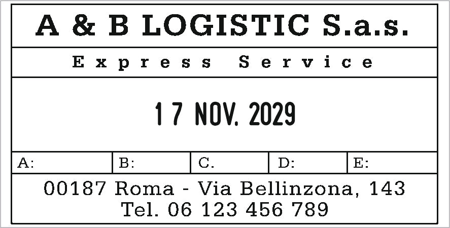 Con un’impronta rettangolare di 75 x 38 mm, offre spazio per 6 righe di testo personalizzato accanto alla data, formattata con giorno, mese e anno per 12 anni consecutivi.