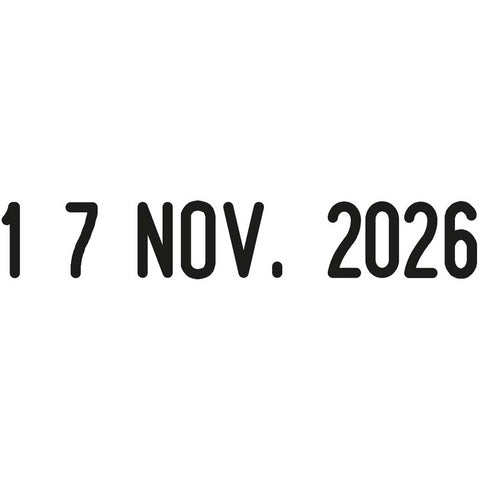 La data, visibile in un formato chiaro e leggibile (giorno, mese in lettere e anno), ha un'altezza di 4 mm e un'impronta di 25 x 4 mm. Perfetto per l'uso quotidiano a casa o in ufficio, questo timbro datario è dotato di un tampone ad inchiostro nero che garantisce migliaia di impronte nitide.